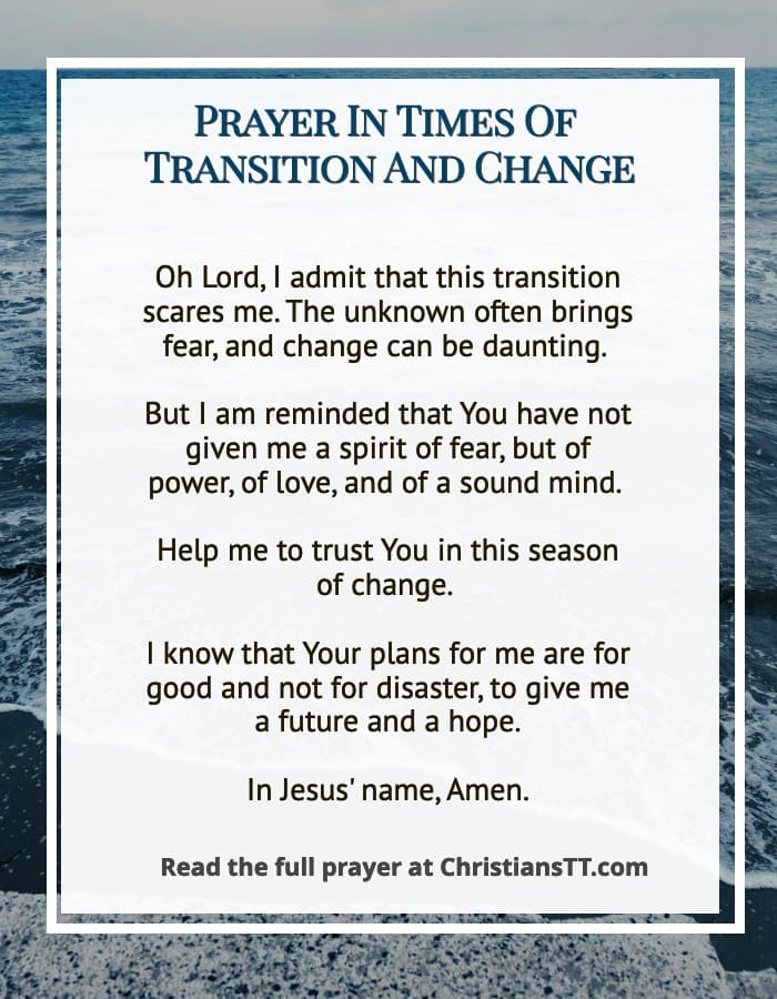 Oh Lord, I admit that this transition scares me. The unknown often brings fear, and change can be daunting. But I am reminded that You have not given me a spirit of fear, but of power, of love, and of a sound mind. I pray that You instill this truth deep within me, that I may draw strength and courage from Your promises.